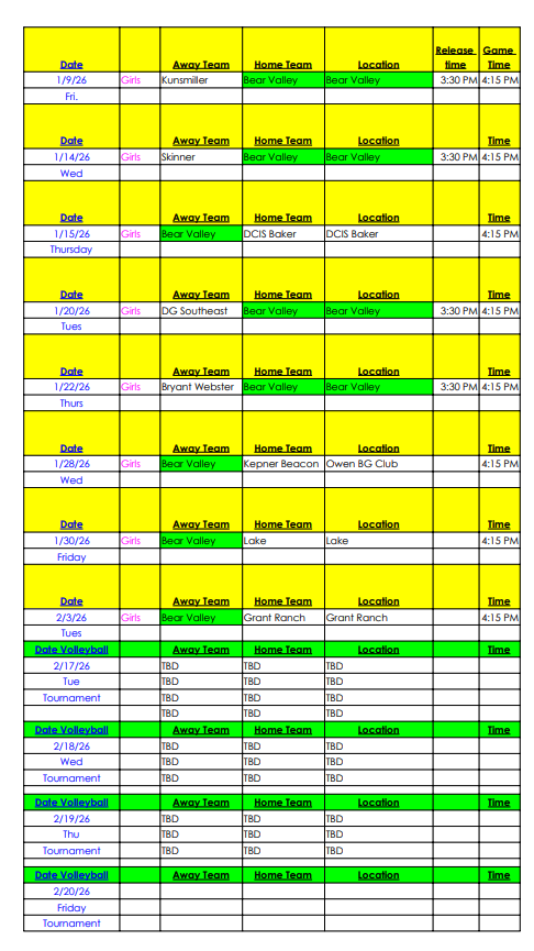 Below outlines our games but they are subject to change – please click HERE to access the most update to date game schedules – each sport has their own tab!